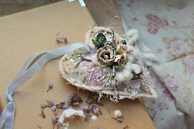 По заданию я сшила интерьерное сердечко с мягкой серединкой, декорированное цветами, веточками, сухоцветами и ягодками в мягкой гамме.